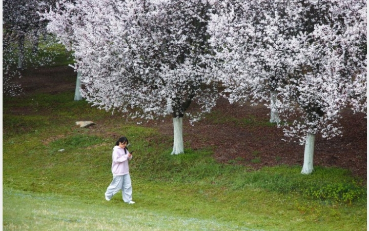 西安河堤路:紫叶李铺就春日花径